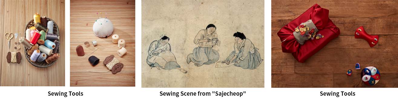 Various tools are used in sewing, and each tool has its own specific role. Traditional Korean sewing tools were designed for detailed work, and each tool has a unique shape suited to its function.
